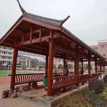 防腐木古建長廊內部結構比普通防腐木長廊要復雜一些,材料也使用量也多一點,我們可為客戶提供防腐木廊道設計效果圖,上門安裝,設計施工安裝一條龍服務。