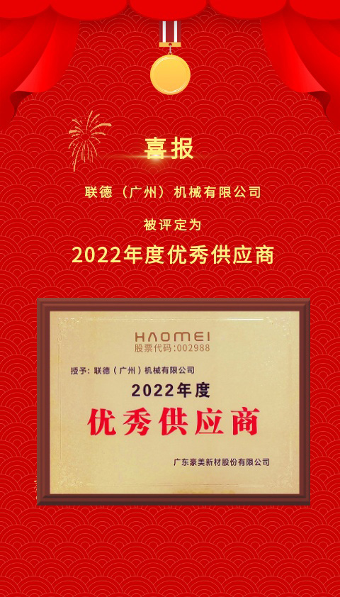 聯(lián)德憑借精湛的專業(yè)技術(shù)、專業(yè)化的服務(wù)、高效率高質(zhì)量的交付以及強(qiáng)大的創(chuàng)新和解決問題的能力,從眾多供應(yīng)商中脫穎而出,榮獲廣東豪美新材股份有限公司“2022年度優(yōu)秀供應(yīng)商”稱號。這不僅是對聯(lián)德工作的認(rèn)可,也是對未來深度合作的鼓勵(lì)。
